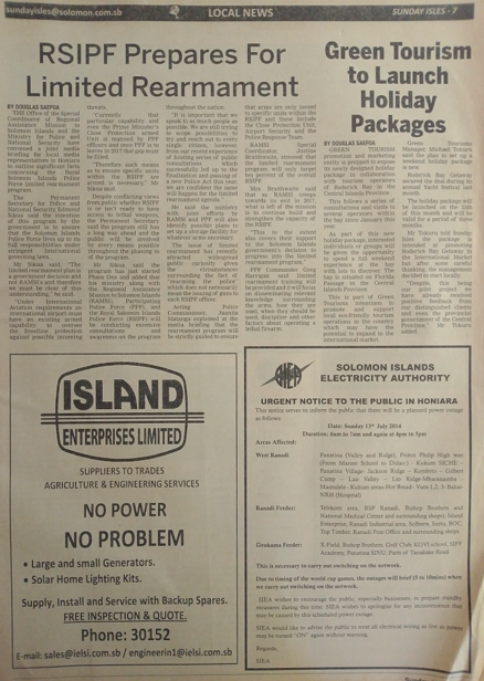 • Solomon Power: (SIEA) – Urgent Notice to the Public in Honiara: SIN 225 July 2014
